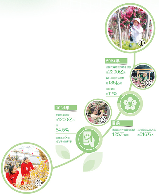 消费端的风吹草动,考验着供给端的应变能力。《报告》显示,2024年花卉电商消费约1200亿元,占全国花卉零售市场总规模的54.5%,电商连续3年成为增长主引擎,电商平台已成为小型观叶和观花植物盆栽的重要销售渠道。目前我国花卉种植面积已达125万公顷,花卉行业从业人员516万人。其中花农和种植工人等生产端人员占行业从业人员的较大比例,为50%—60%。