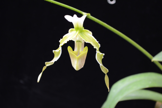 据介绍,长瓣兜兰主要分布于云南及广西喀斯特地貌的岩缝环境中。其形态特征显著:花瓣细长呈带形,长8.5-12厘米,宽6-7毫米,自中部至基部边缘呈波浪状卷曲,形似麻花辫。花色组成复杂,麻花状花瓣呈绿色或黄绿色,具深色条纹;唇瓣绿黄色,具浅栗色晕;中萼片与合萼片白色,具绿色脉纹。叶片基生,二列排列,长15-30厘米,宽3-5厘米,质地厚实。