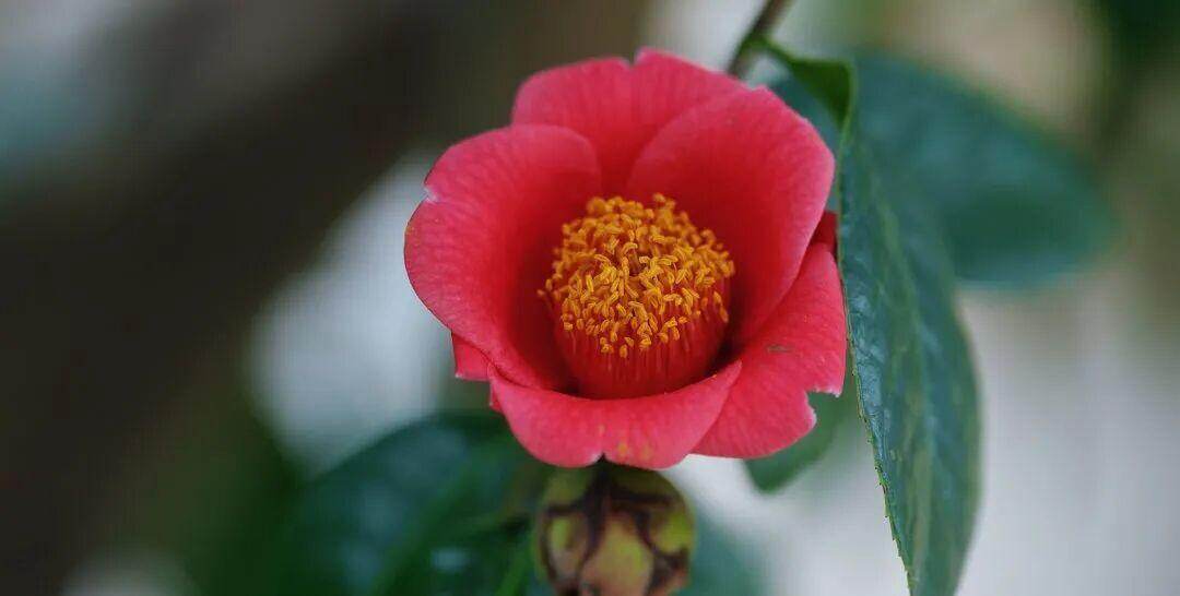 循着1公里长的自然教育径漫步,目之所及皆是动人景致。广宁红花油茶的花朵呈明艳喇叭状,六七枚花瓣舒展翩跹,色泽浓艳似火,在油亮翠绿的革质叶片映衬下,宛如跃动在枝桠间的暖光。有的含苞轻绽、娇态可掬,有的全然舒展、尽兴盛放,每一朵都透着蓬勃张力,踩在步道上,便沉浸式坠入这片冬日限定的艳红秘境。