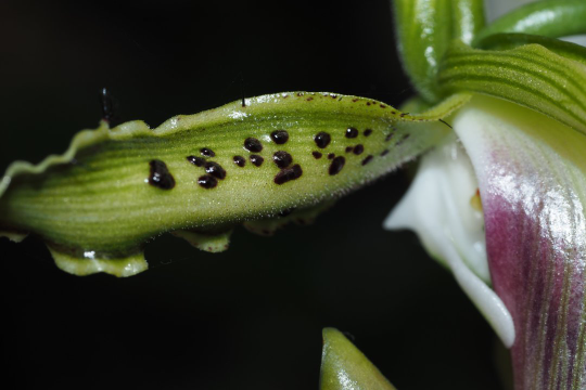 ▲长瓣兜兰花瓣上的黑色突出物模拟黑带食蚜蝇的幼虫食物